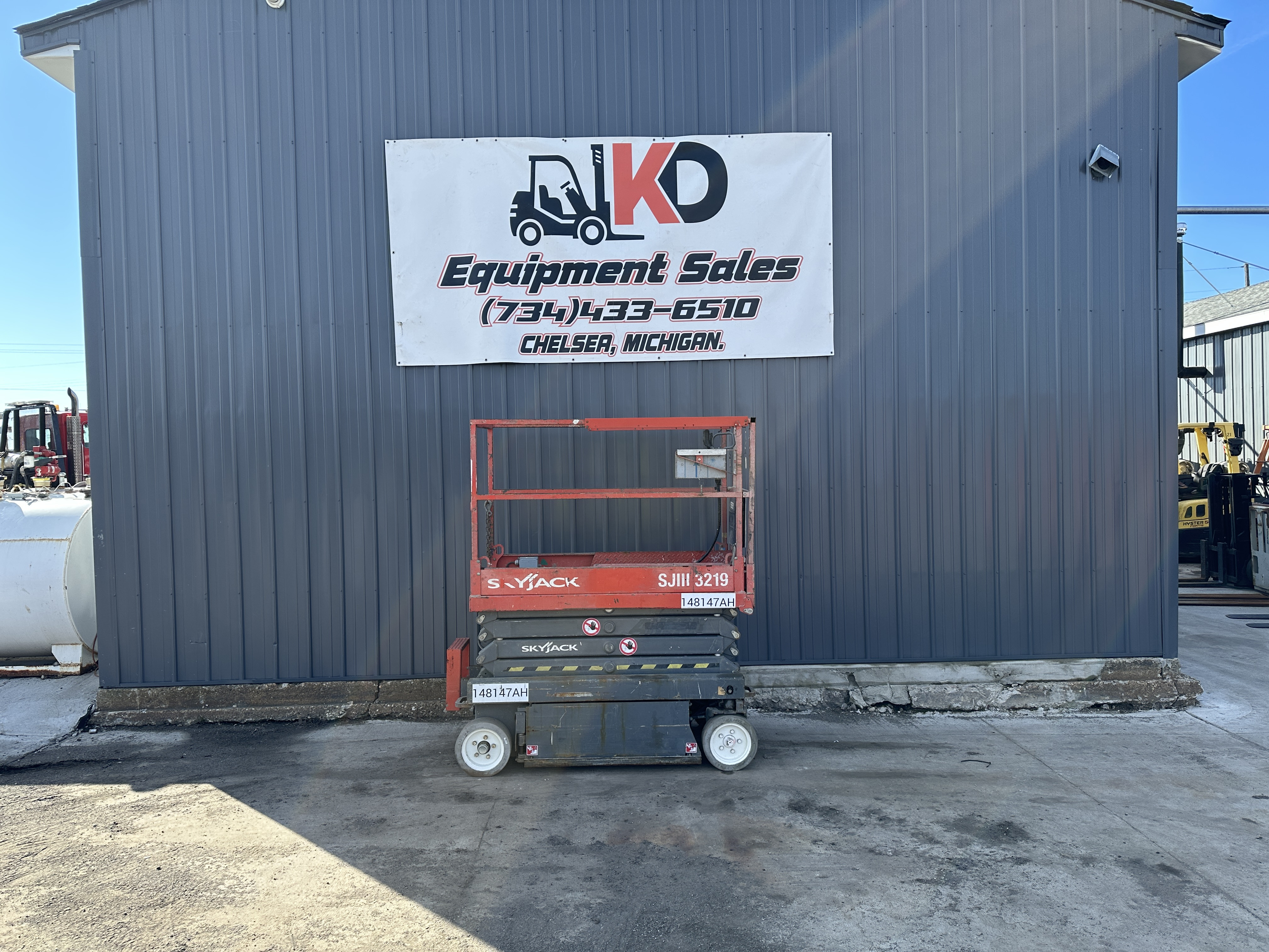 Used Skyjack SJIII 3219 Scissor Lift - Runs and operates great. Key Specifications: - Maximum platform height: 19 ft - Working height: 25 ft - Lift capacity: 550 lb - Power: Electric (battery) - Tire type: Traction Cushion - Hours: 269 - New Tires Delivery available nationwide.