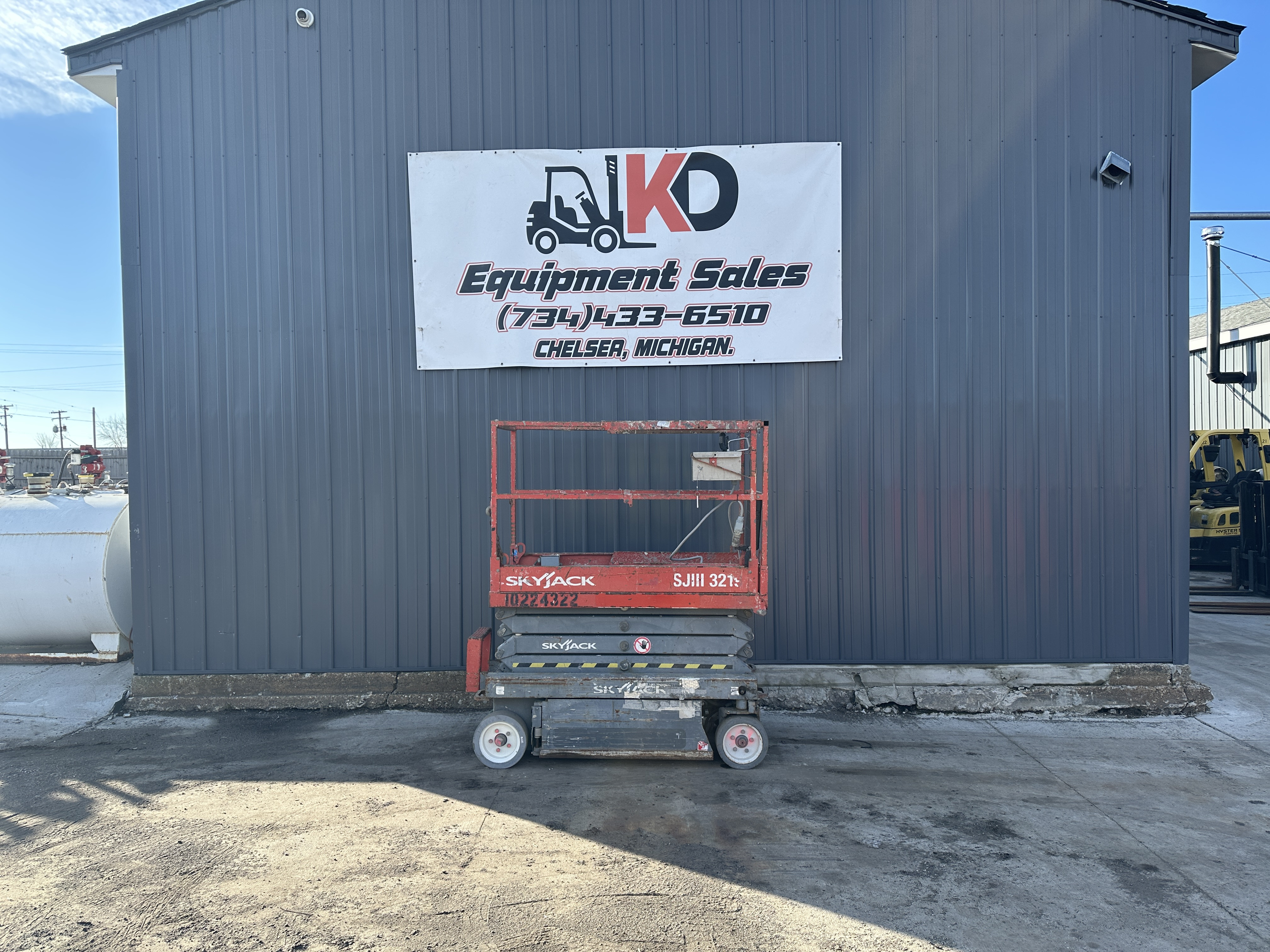Used Skyjack SJIII 3219 Scissor Lift - Runs and operates great. Key Specifications: - Maximum platform height: 19 ft - Working height: 25 ft - Lift capacity: 550 lb - Power: Electric (battery) - Tire type: Traction Cushion - Hours: 377 Delivery available nationwide.