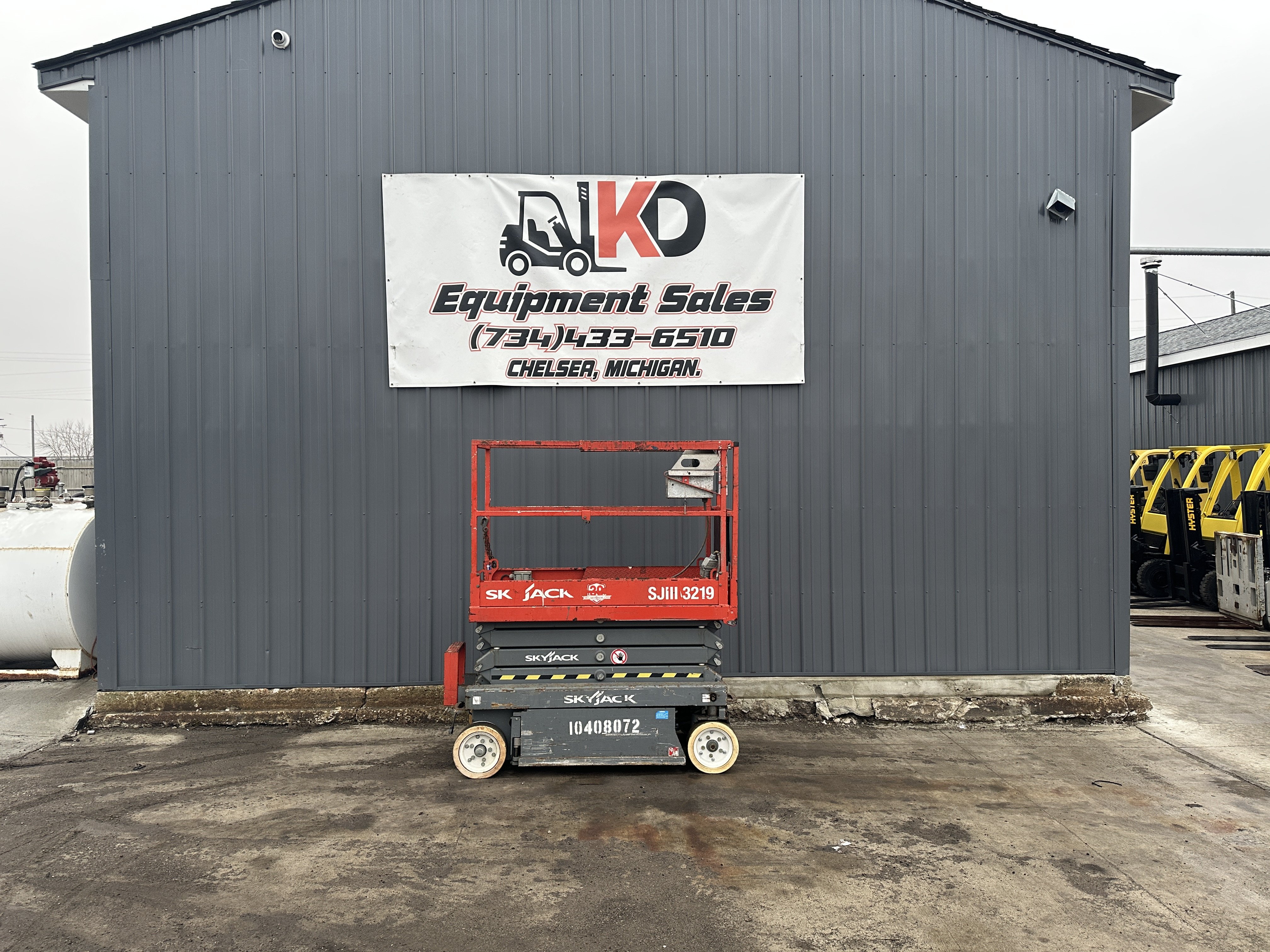 Used Skyjack SJIII 3219 Scissor Lift - Runs and operates great. Key Specifications: - Maximum platform height: 19 ft - Working height: 25 ft - Lift capacity: 550 lb - Power: Electric (battery) - Tire type: Traction Cushion - Hours: 156 - Like-New Tires Delivery available nationwide.