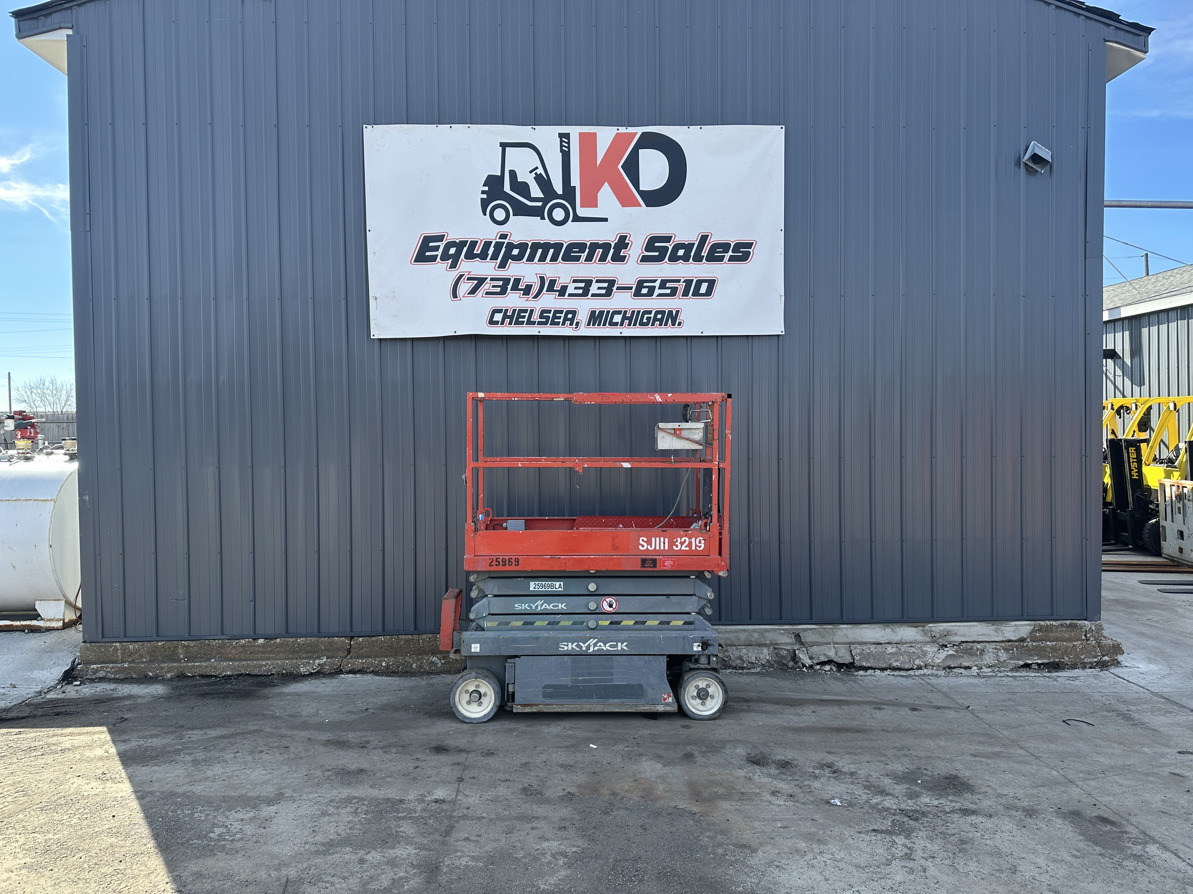 Used Skyjack SJIII 3219 Scissor Lift - Runs and operates great. Key Specifications: - Maximum platform height: 19 ft - Working height: 25 ft - Lift capacity: 550 lb - Power: Electric (battery) - Tire type: Traction Cushion - Hours: 156 - New Tires Delivery available nationwide.