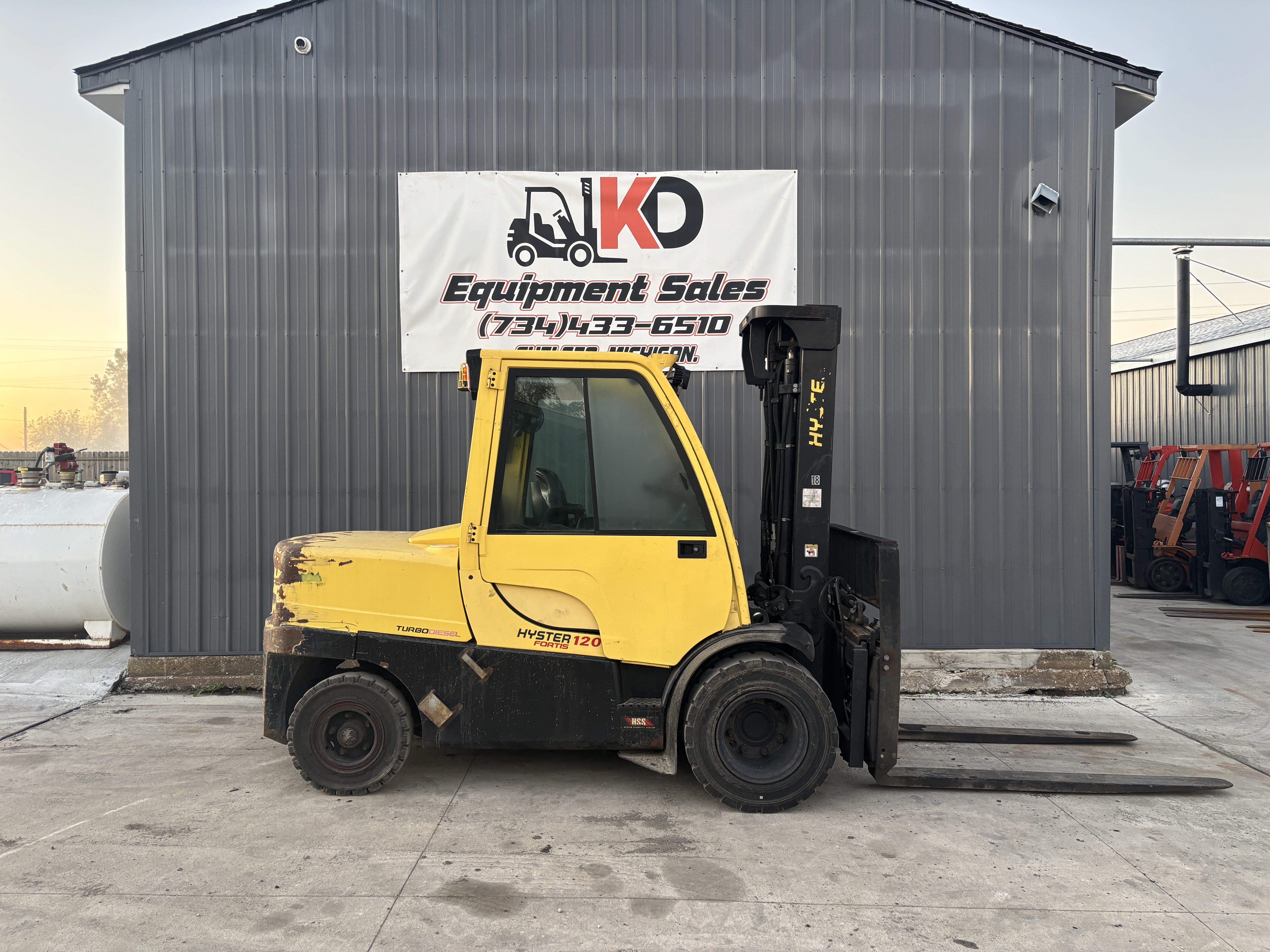 Used Hyster H120FT Pneumatic Forklift – Runs and operates great. Key Specifications: - 12,000 lb lifting capacity - 208" maximum lift height (17.3 feet) - Side shift - Fork positioner - Diesel powered for heavy-duty applications - Pneumatic tires for outdoor terrain - Delivery available nationwide